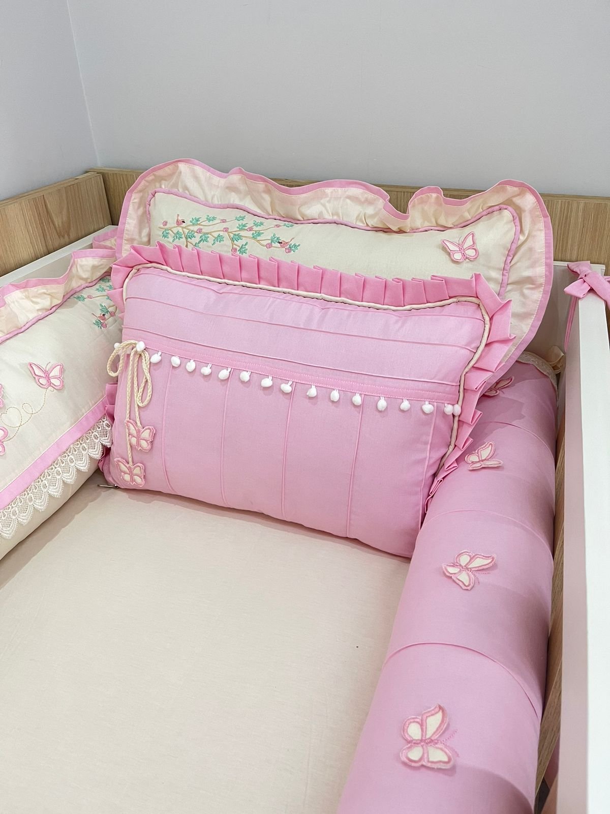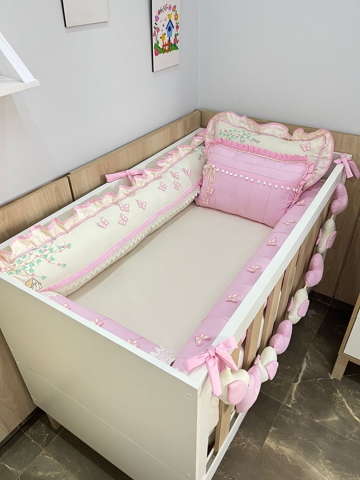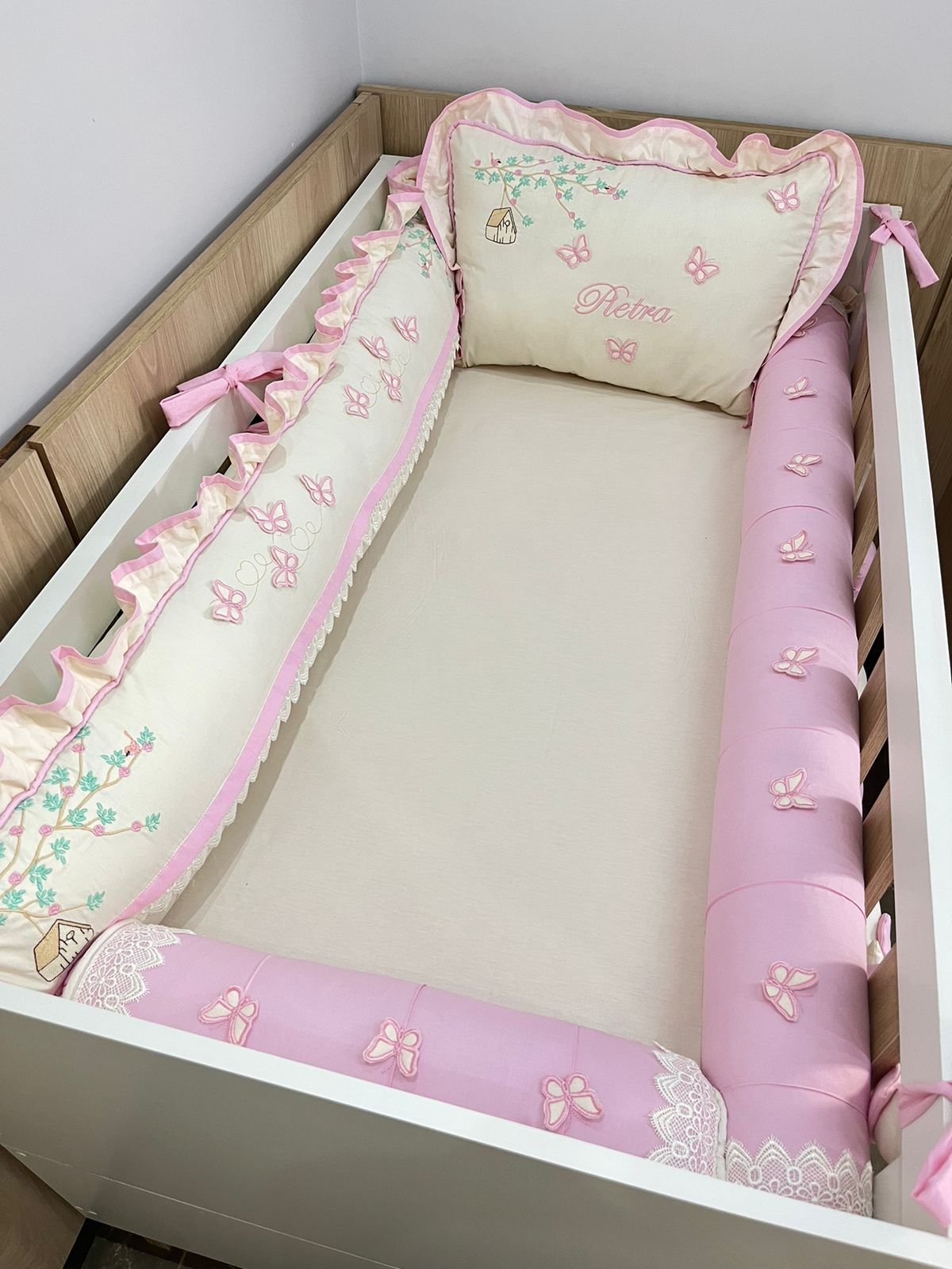 1 protetor lateral com babado, bordado, borboletas 3d e renda.