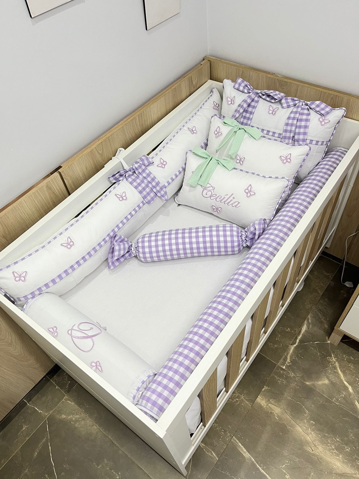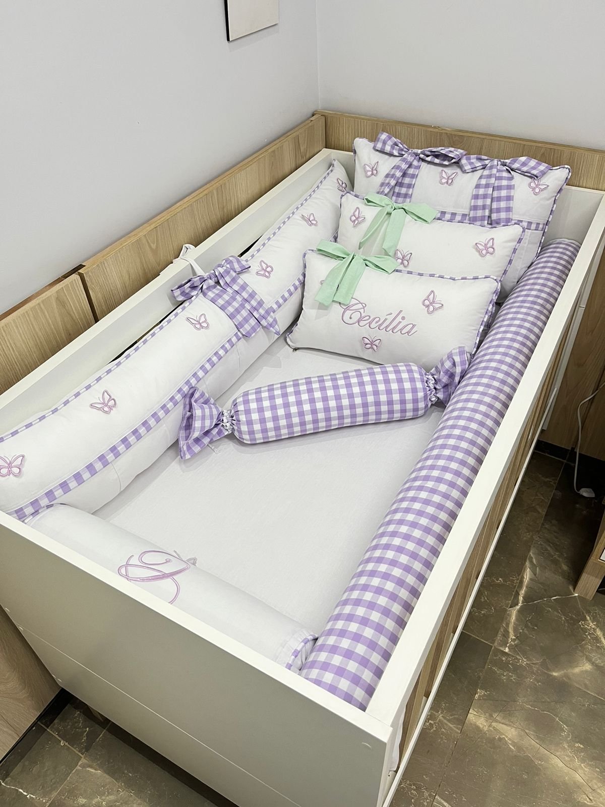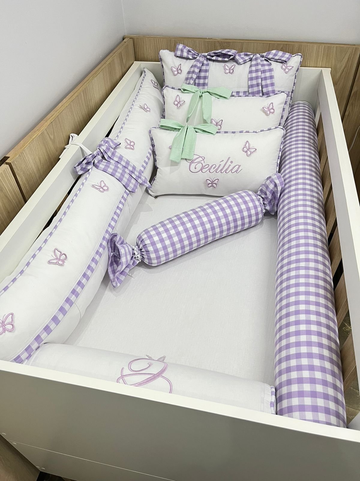 1 protetor lateral com bordado e borboleta 3d ( com ziper pra facilitar a lavagem).