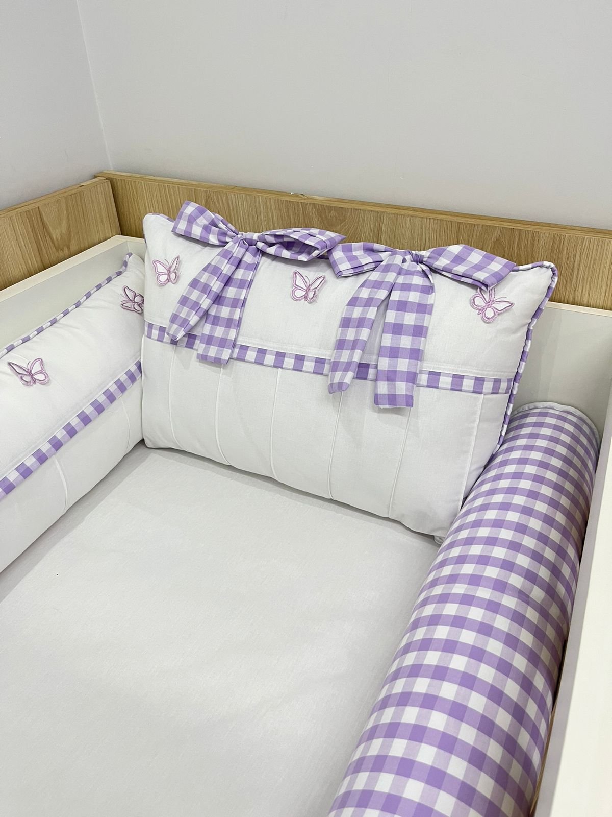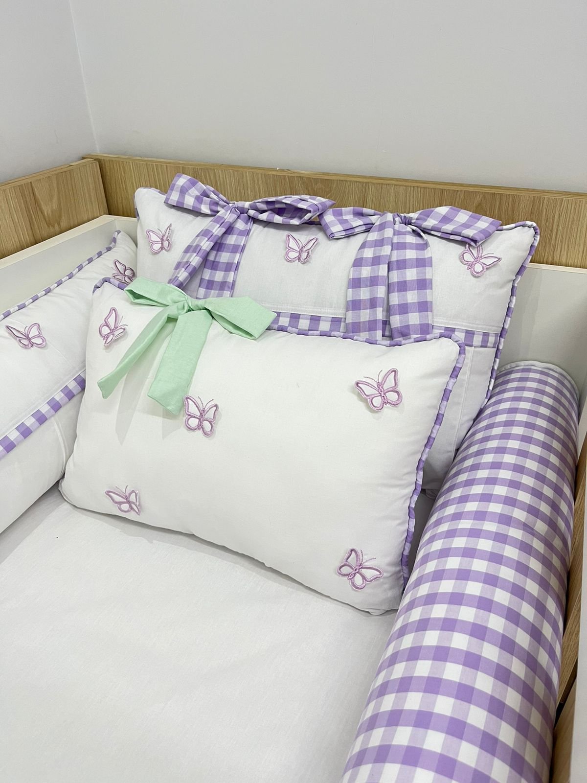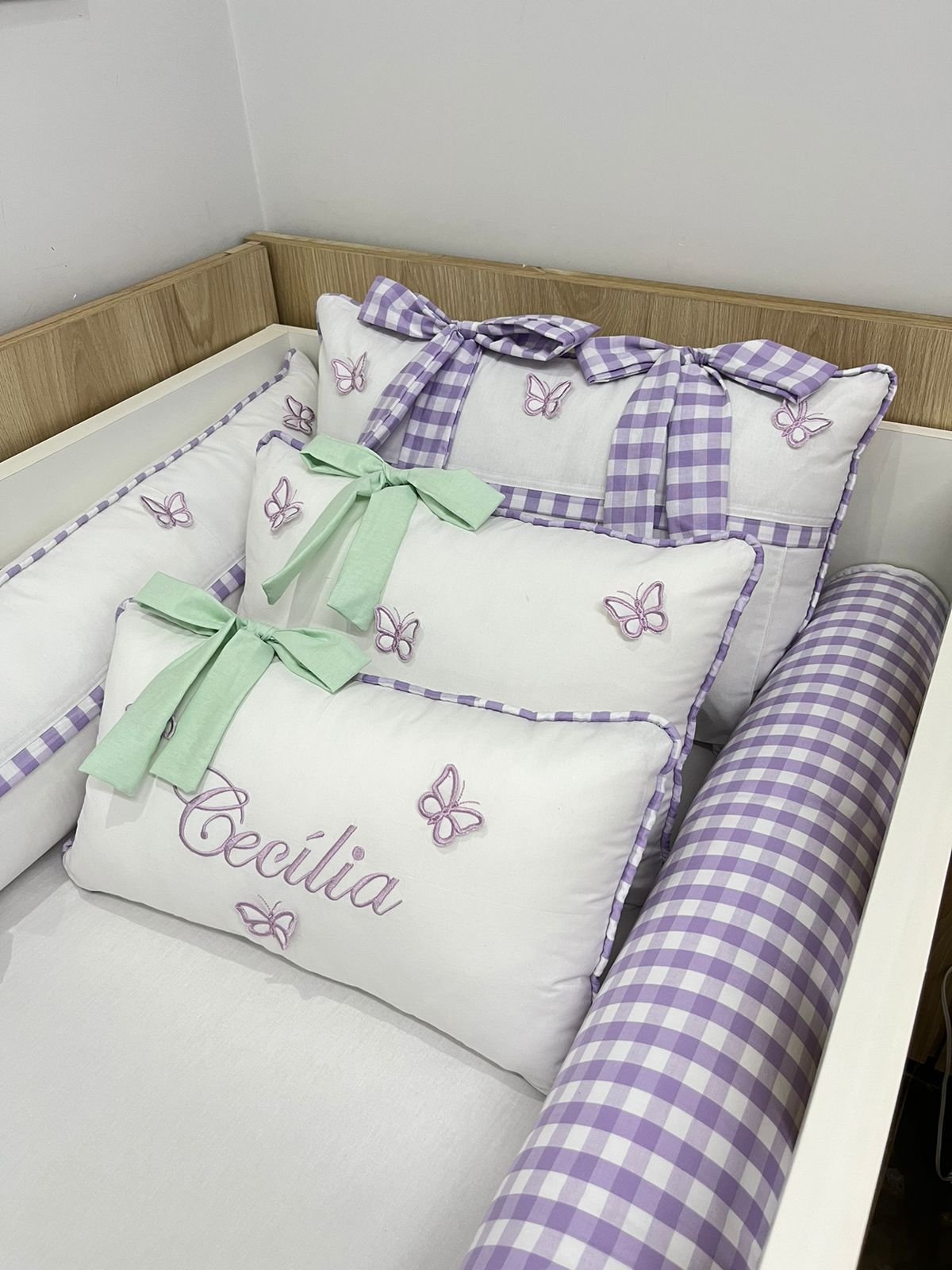 1 protetor lateral com bordado e borboleta 3d ( com ziper pra facilitar a lavagem).