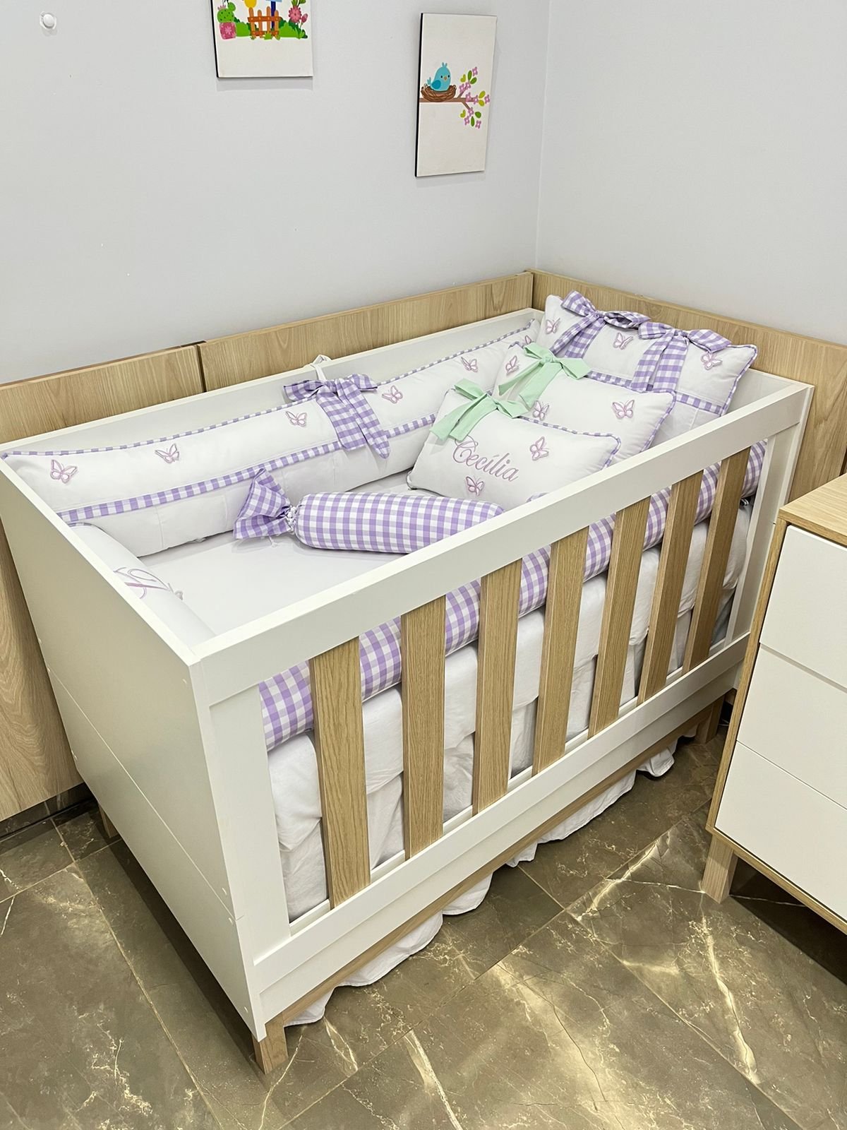 Nosso enxoval jardim xadrez lilás foi elaborado com toda a delicadeza que o tema traz.