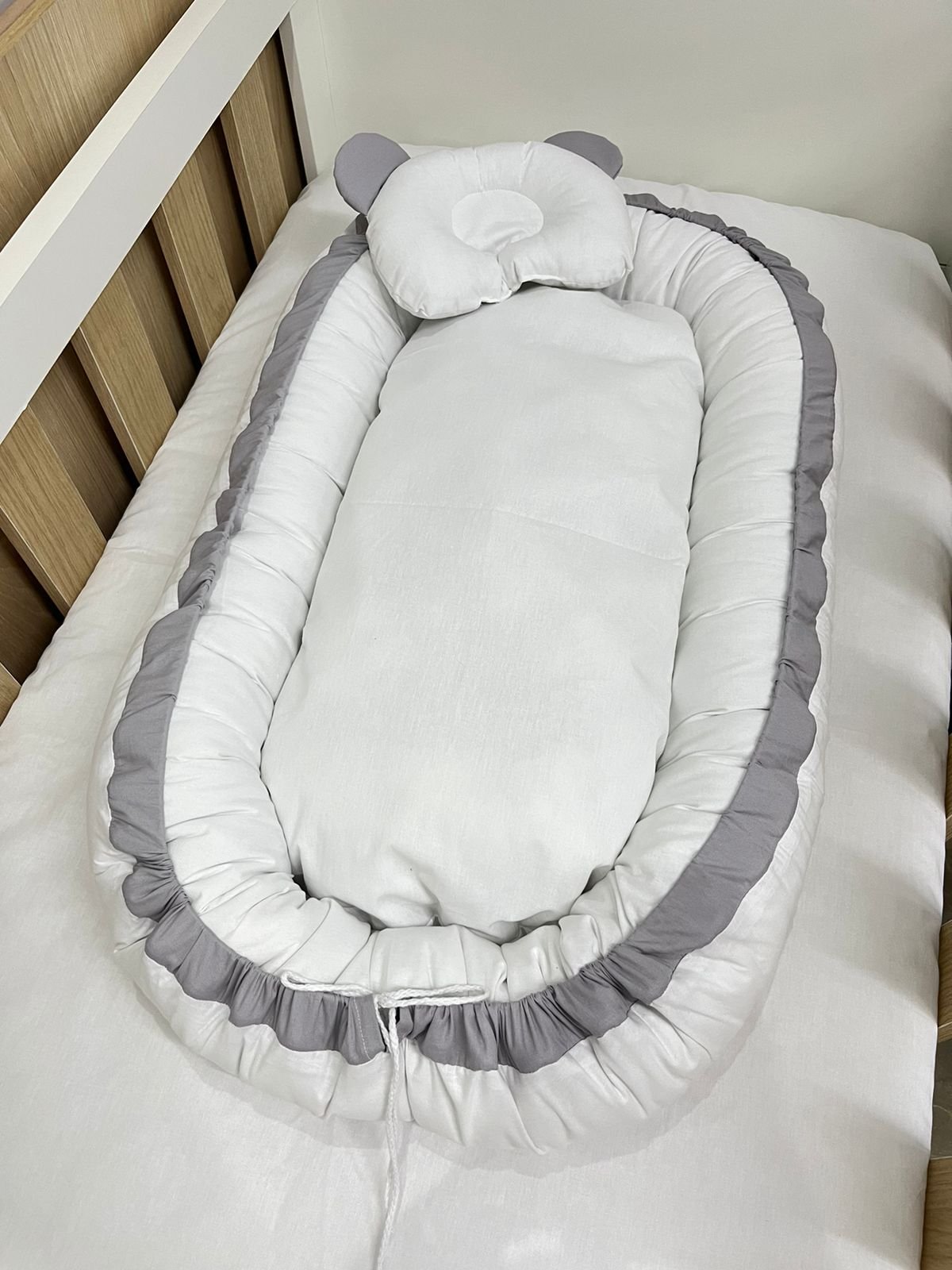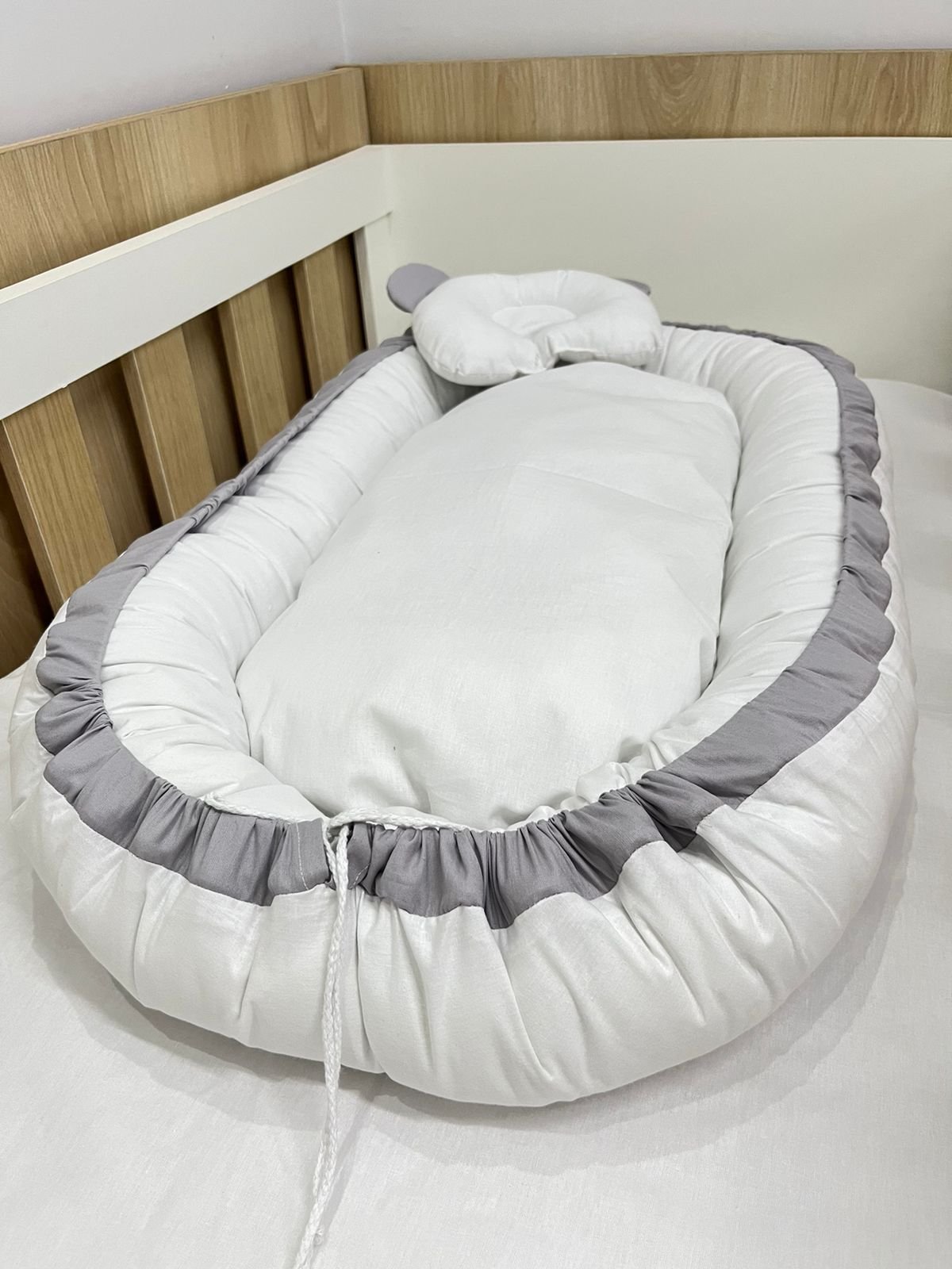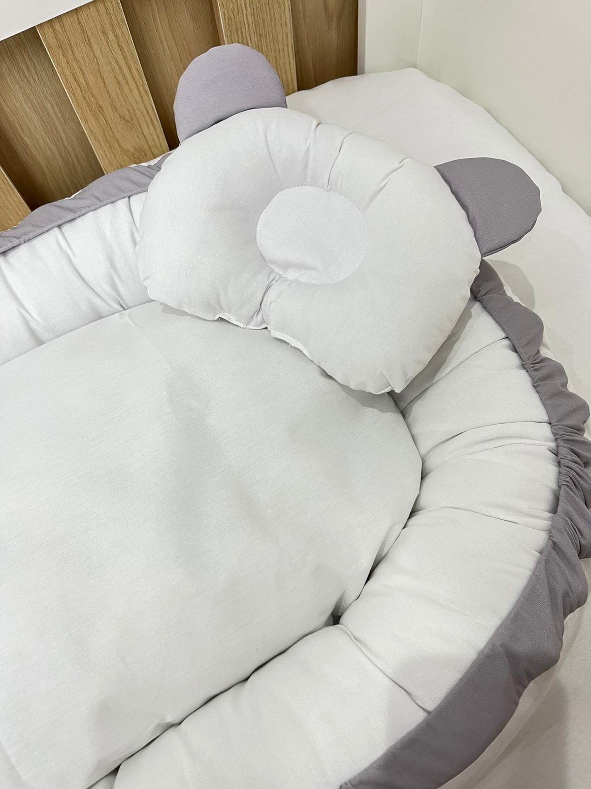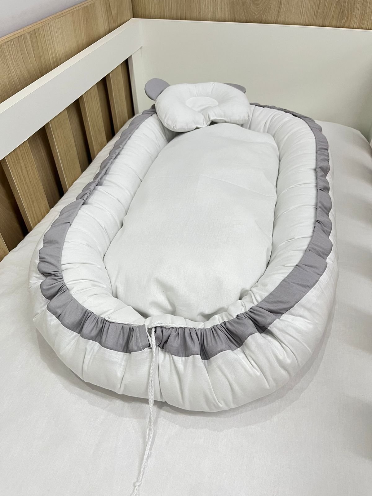 Ninho redutor de berço branco e cinza.
