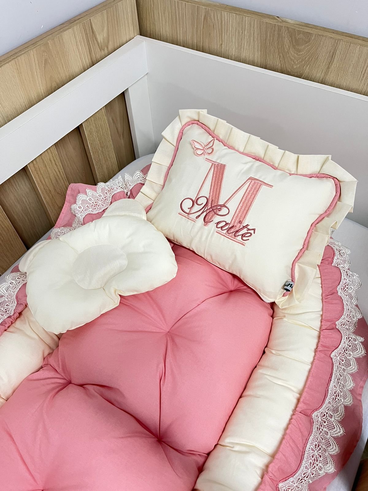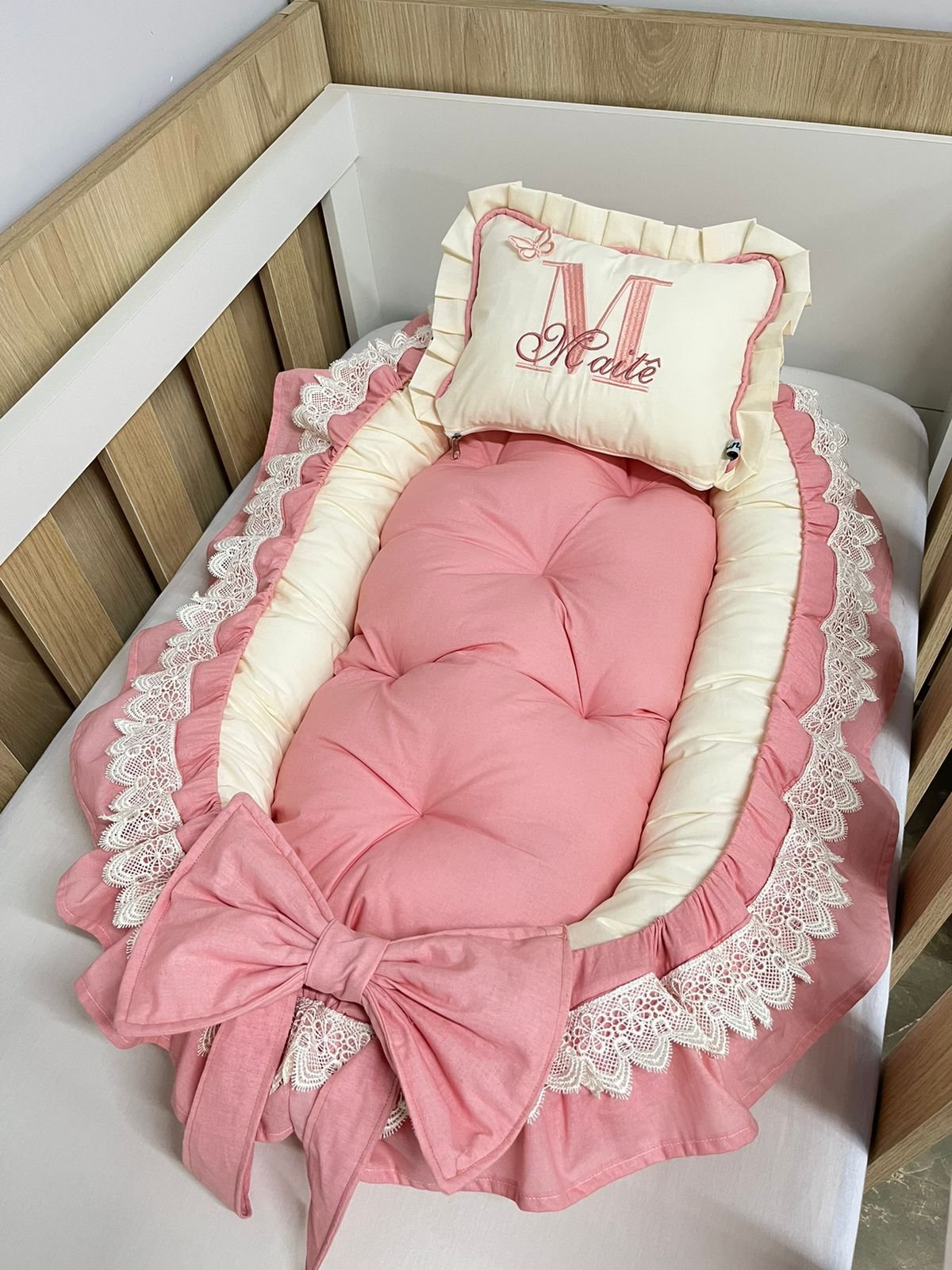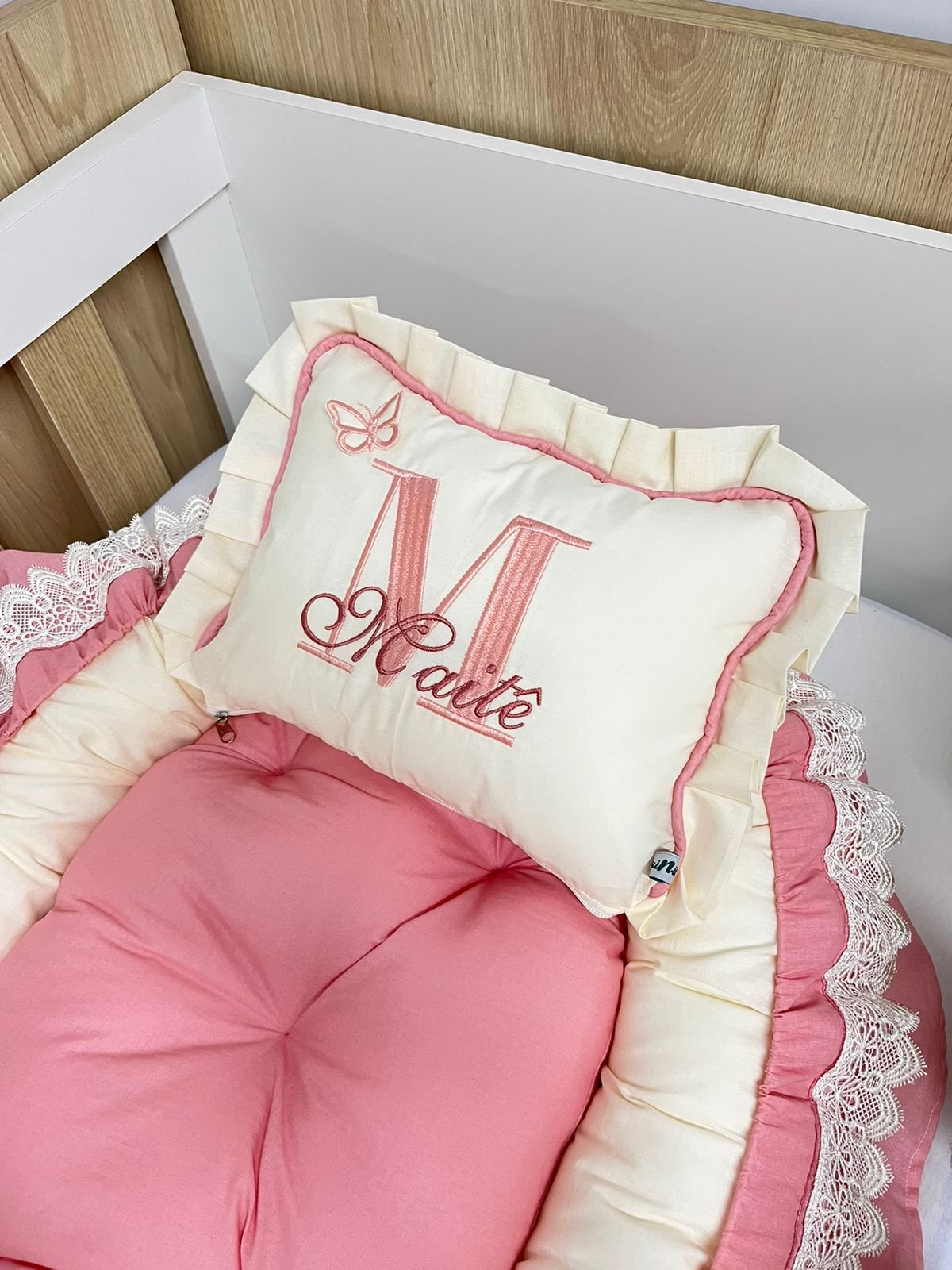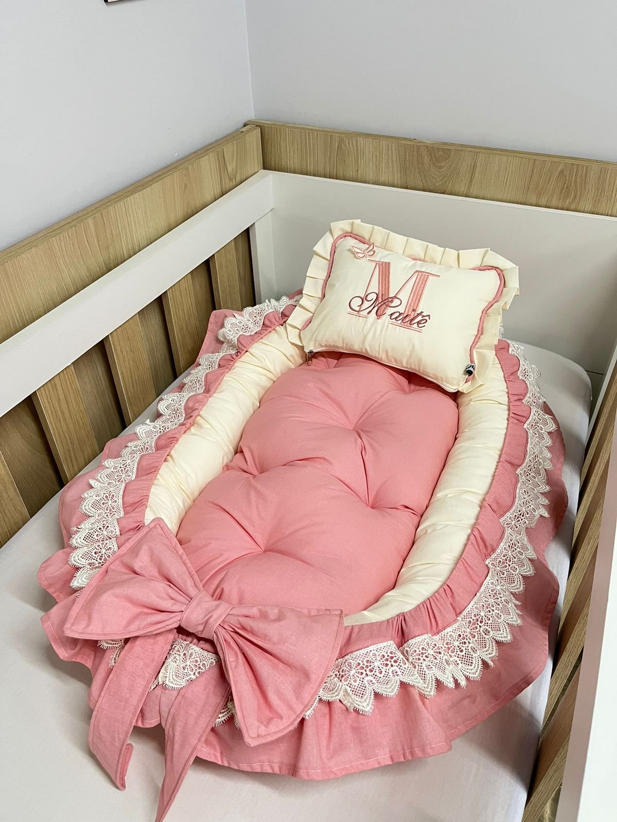 cor: off e rose, com detalhes na renda, babado em toda lateral, e laço removível .