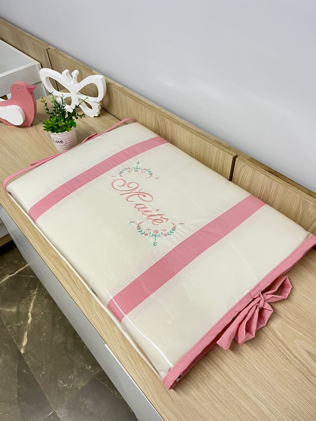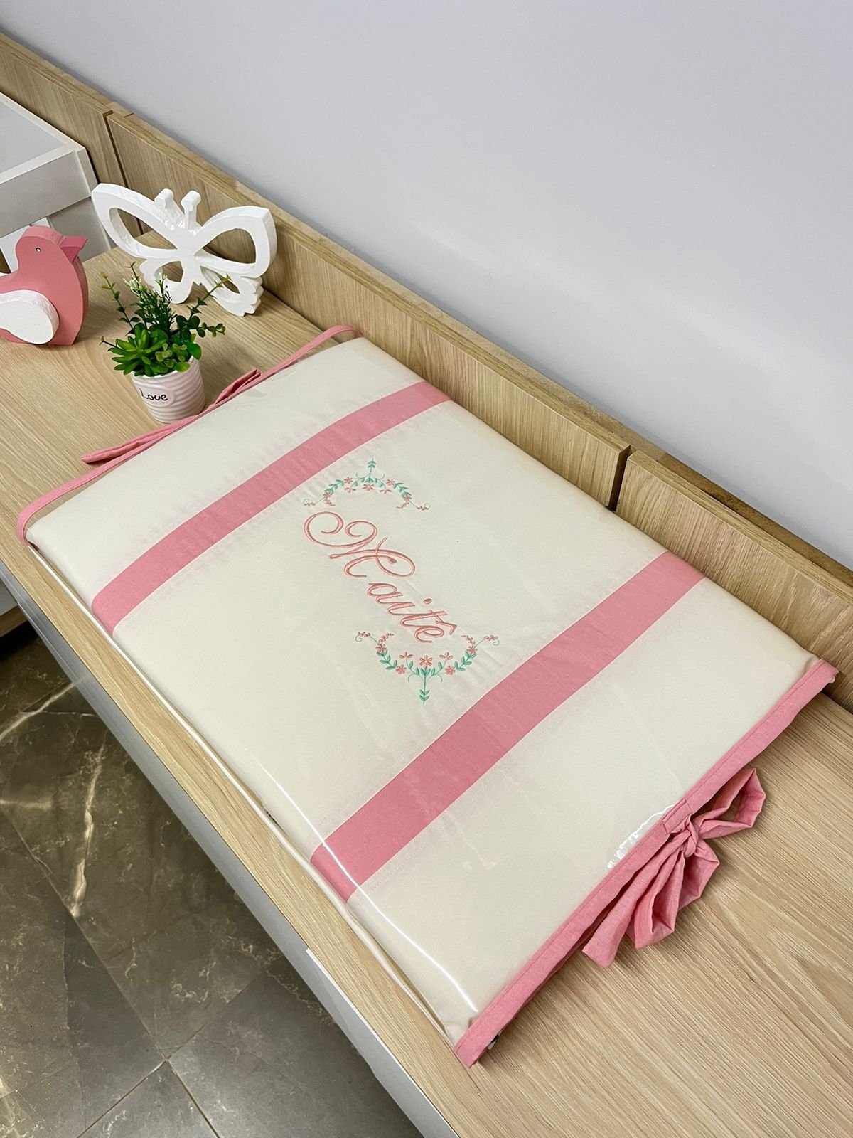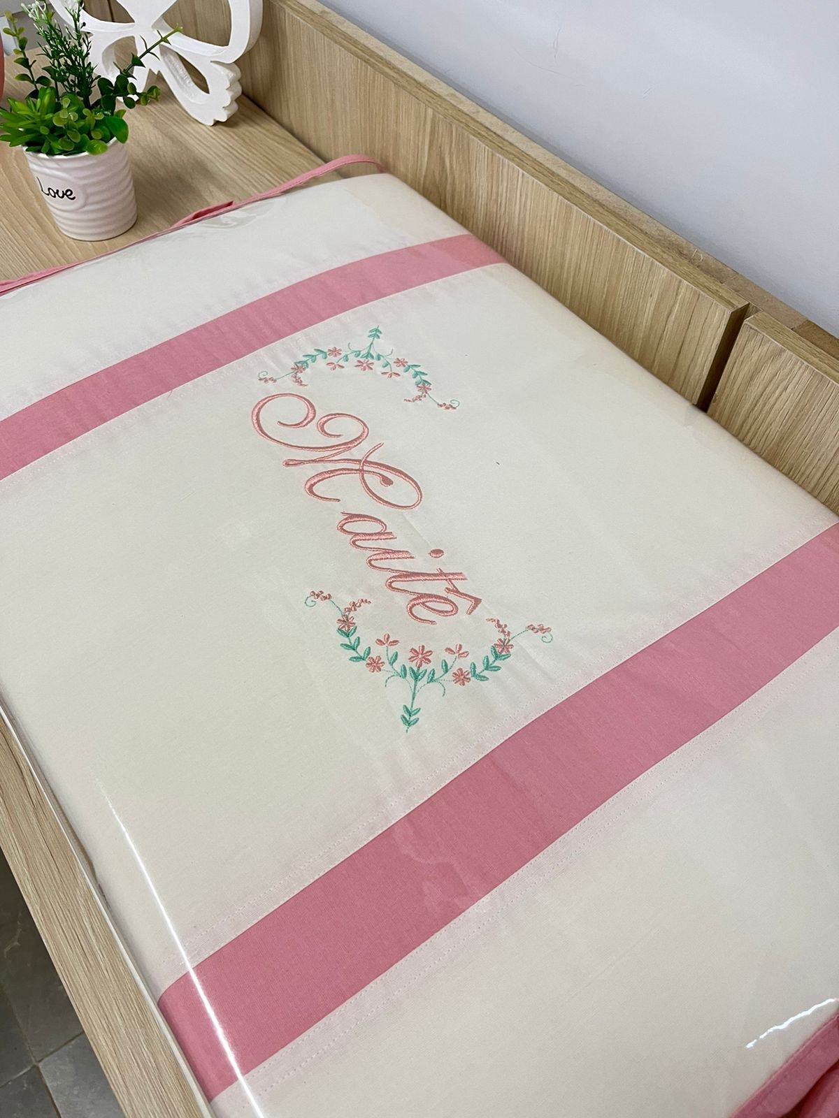 capa de tecido, com zíper, e com bordado da escolha da mamãe